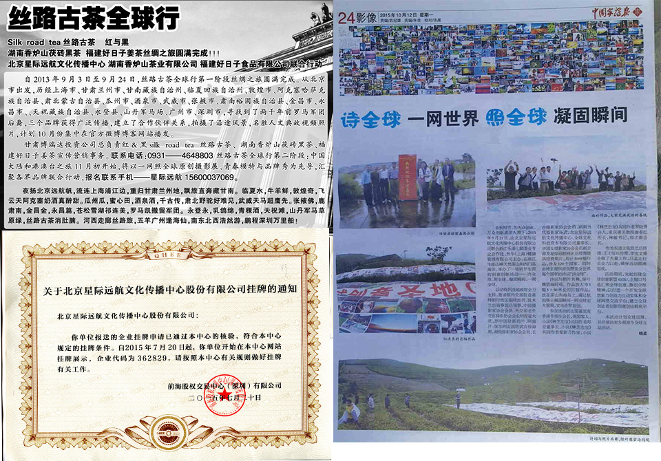 全球系列追杀小说 绝令追杀 丝路古茶外交官茶 限量定制众筹出版发行 方案 一. 共限量出版一万本。 每本六千元。 回报: 1. 每本书由作者亲笔签字。 2. 送丝路古茶一箱,消肚皮通便降脂防骨质酥松。 3. 参与拍摄丝路古茶系列微电影。 联系人:杨正 13501337273. 并 诗全球照全球 实施方案 北京星际远航文化传播中心 (深圳前海股权交易中心挂牌企业,代码:362829) 一,实施地点 今年九月在中国浙江,明年在海外巡展。 二,山盟海誓浪漫天---全球创意乐园浙江基地简介 该基地为北京星际远航远航文化传播中心股份有限公司投资参股创建。位于浙江省温岭县牛郎山和西门岛。以一百五十亩天然茶山和天然岛屿为基地,创建全球创意乐园中国浙江基地,命名为“山盟海誓浪漫天” 该基地充分组织当地农家乐和天然山景海境资源,打造一个开发全球艺术家想象力创造力互动交流平台,建立全球创业者创新创意创业孵化平台。 二,诗全球照简介 凝固瞬间,一网全球! 照全球诗全球:在浙江雁荡山麓一百八十亩茶山和西门岛创作基地,以星际远航总经理杨正历一百二十国原创照片并诗歌全球各国的作品,并邀请中国外交官武官摄影家等四人的作品,放大两个五米宽五十米长的巨幅作品,放在茶山和海岛上,通过航拍和网络传播展示凝固瞬间一网全球。成功后,全球巡展。 三,北京星际远航远航文化传播中心股份有限公司宗旨: 远航,翱翔永恒星际! 远航,播撒智圣文明! 远航,激荡时代强音! 自2001年创建,投资发明独创系列作品和产品: 中国首部数学文化电视专题片 《超越-献给国际数学家大会》,《华夏数学之光》。 五十集电视剧本《开国总理周恩来》。 长篇小说、电影剧本、电子游戏《郑和大航海》 。 中国首部外交官题材长篇小说、电影剧本、电视剧本《血脉国魂》。 系列丝路古茶发明专利,商标,著作权,歌曲,动漫,电子游戏,全球茶网,大型歌舞剧本《茶香丝舞》,长篇侦探探险小说《绝令追杀丝路古茶外交官茶》。 以上为主要产品。 四, 星际远航主题歌 创意星光 (优美抒情,四分之三节拍) 杨正作词 蓝色星海闪闪星光 是我美丽梦幻神秘心乡 白云飘飘自由飞扬 伴我星际翱游自由远航 创意星光多么闪亮 人类精神永恒太阳 创意星光多么辉煌 指引蓝色星球缓缓启航 啊 创意星光多么闪亮 创意星光多么辉煌 蓝色星球缓缓启航 蓝色星球缓缓启航! 远航,远航 翱翔星际 永恒远航! 远航,远航 播撒文明 智圣远航! 远航,远航 激荡强音 世代远航!